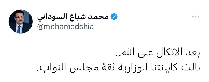 وقال السوداني في تغريدة على تويتر: "بعد التوكل على الله نالت كابينتا الوزارية ثقة مجلس النواب".