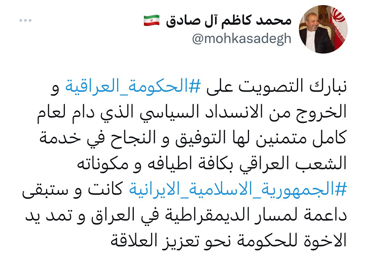 وذكر السفير الايراني لدى العراق محمد كاظم آل صادق في تغريدة : "نبارك التصويت على الحكومة العراقية و الخروج من الانسداد السياسي الذي دام لعام كامل"، متمنياً لها "التوفيق و النجاح في خدمة الشعب العراقي بكافة اطيافه و مكوناته".