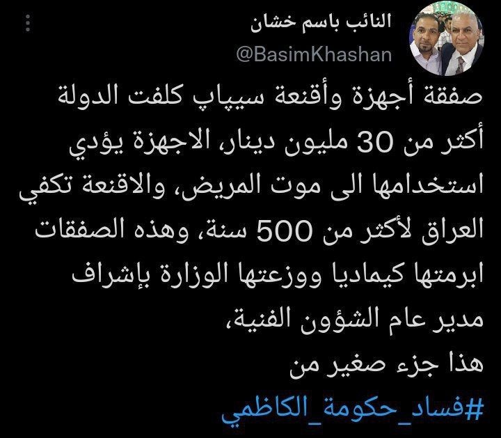 النائب باسم خشان يغرد بشأن صفقة أجهزة طبية تؤدي إلى موت المريض وتكفي العراق لأكثر من 500 سنة