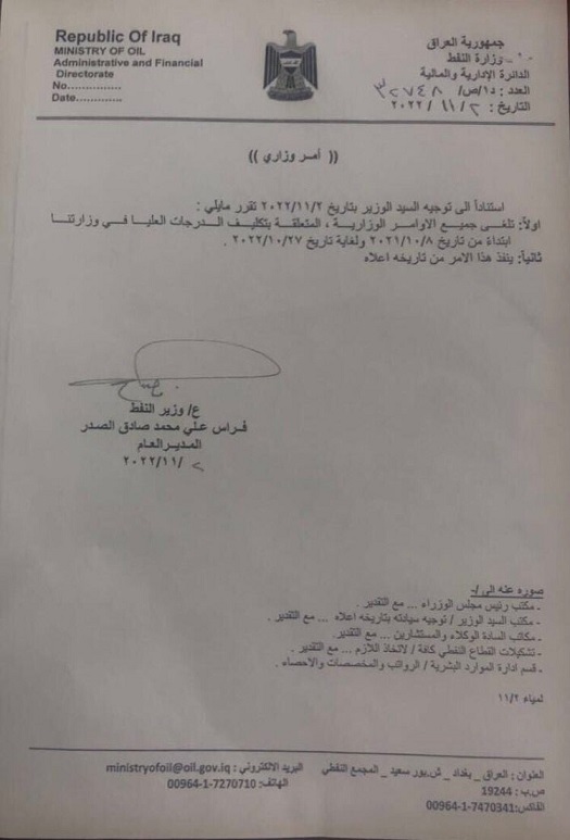 وجاء في وثيقة مذيلة مدير عام الدائرة الإدارية والمالية في الوزارة، فراس الصدر،، إنه "استناداً إلى توجيهات وزير النفط بتاريخ 2 تشرين الثاني تقرر إلغاء جميع الأوامر الوزارية المتعلقة بتكليف الدرجات العليا بوزارتنا ابتداءً من تاريخ 8 تشرين الأول 2021، ولغاية تاريخ 27 تشرين الأول 2022".