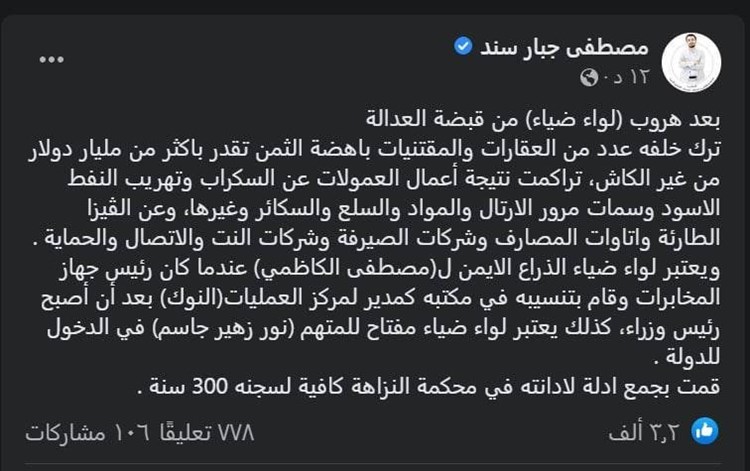 مذكرة اعتقال بحق اللواء رئيس مركز العمليات الوطني ضياء الموسوي والنائب مصطفى سند يقول انه هرب وترك وراءه مقتنيات بمليار دولار