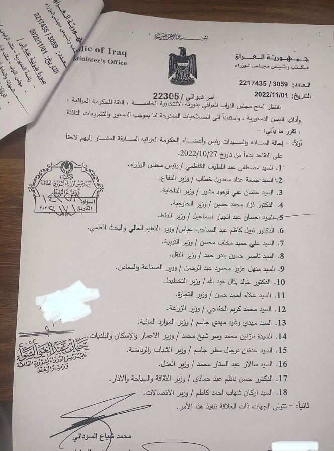 وبحسب الامر المرقم (22305) فأنه "بالنظر الى منح مجلس النواب الثقة للحكومة العراقية الجديدة واداءها اليمين الدستورية واستنادا للصلاحيات الممنوحة لنا وفقاً للدستور، تقرر احالة رئيس واعضاء مجلس الوزراء الى التقاعد".