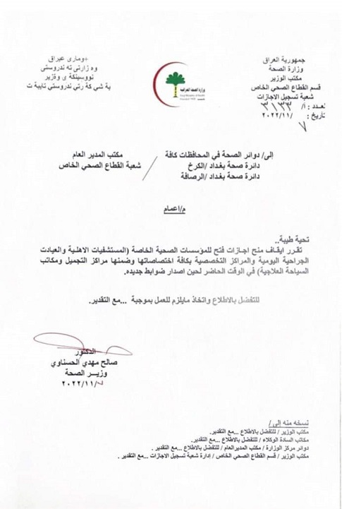 وجاء في وثيقة مذيلة بتوقيع الوزير، صالح الحسناوي إنه "تقرر ايقاف منح اجازات فتح للمؤسسات الصحية الخاصة ( المستشفيات الاهلية والعيادات الجراحية اليومية والمراكز التخصصية بكافة اختصاصاتها وضمنها مراكز التجميل ومكاتب السياحة العلاجية ) في الوقت الحاضر لحين اصدار ضوابط جديدة".