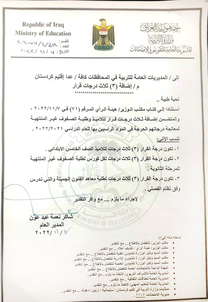 وبحسب وثيقة فإن تعليمات قرار اضافة الـ3 درجات للصفوف غير المنتهية، يشمل جميع الصفوف غير المنتهية، ويكون للدراستين (الصباحية والمسائية).
