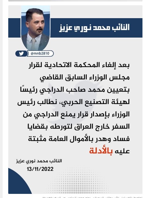 نائب يطالب السوداني بمنع محمد الدراجي من السفر لتورطه بالفساد ( تغريدة )