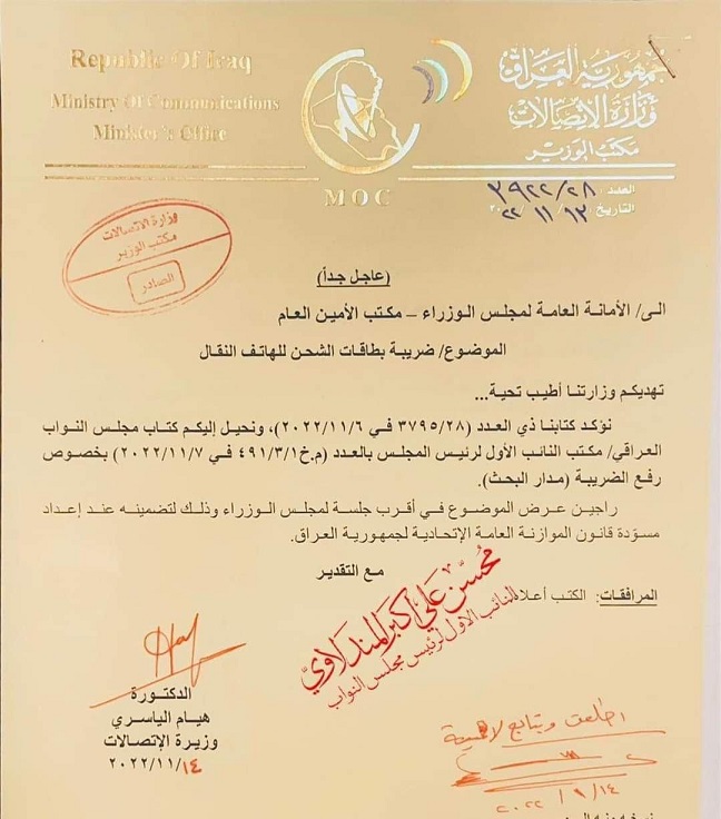 وقالت وزيرة الاتصالات هيام الياسري في بيان ، أن "مجلس النواب عازم على إلغاء ضريبة بطاقات الشحن"، مؤكدة على "ضرورة عرضها على مجلس الوزراء لغرض التصويت على إدراج إلغائها في موازنة 2023".