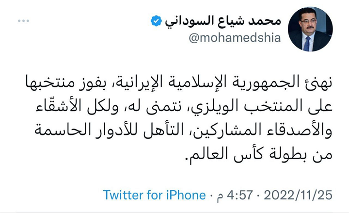 وقال السوداني في تغريدة عبر تويتر "نهنئ الجمهورية الإسلامية الإيرانية، بفوز منتخبها على المنتخب الويلزي، نتمنى له، ولكل الأشقّاء والأصدقاء المشاركين، التأهل للأدوار الحاسمة من بطولة كأس العالم".
