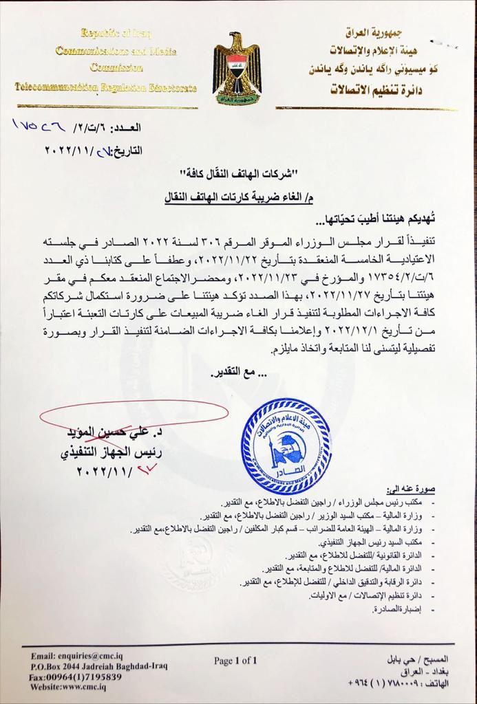 وذكر بيان للهيئة،، أن "رئيس هيئة الإعلام والاتصالات علي المؤيد عقد اجتماعاً طارئاً مع شركات الهاتف النقال العاملة في العراق حول التطبيق الفوري لقرار الغاء ضرائب الكارتات الذي تبنته الهيةه وأقره مجلس الوزراء مؤخراً، بحضور كبار المسؤولين التنفيذيين في شركات الهاتف ومسؤولين من الهيئة العامة للضرائب، إذ جرت مناقشة إجراءات الشركات بصدد القرار اعلاه الذي سيكون واجب التطبيق بدءا من اليوم الأول من الشهر المقبل".
