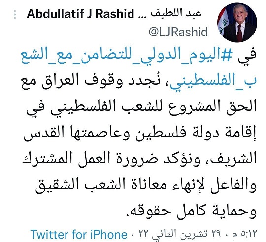 وقال رشيد في تغريدة عبر تويتر، ، "في اليوم الدولي للتضامن مع الشعب الفلسطيني، نُجدد وقوف العراق مع الحق المشروع للشعب الفلسطيني في إقامة دولة فلسطين وعاصمتها القدس الشريف".
