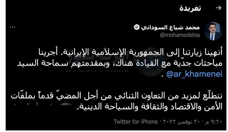 وقال السوداني في تغريدة عبر تويتر ” أنهينا زيارتنا إلى الجمهورية الإسلامية الإيرانية، وأجرينا مباحثات جدّية مع القيادة هناك”.