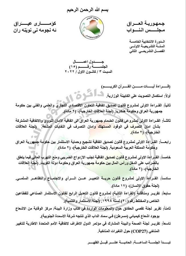 وأضافت انه "ستتم القراءة الأولى لمشروع قانون تصديق اتفاقية التعاون الاقتصادي والتجاري والعلمي والفني بين العراق وهنكاريا"، وأيضا القراءة الأولى لمشروعي انضمام العراق الى اتفاقية الأمان النووي والاتفاقية المشتركة بش امان التصرف في الوقود المستهلك وامان التصرف في النفايات المشعة".