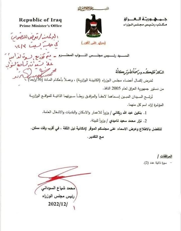 وأظهرت وثيقة مذيلة بتوقيع السوداني،، ترشيح بنكين ريكاني لمنصب وزير الإعمار والإسكان ونزار محمد سعيد لوزارة البيئة.
