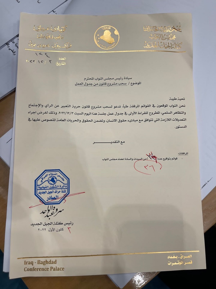 وأكدت، أنه "تم البدء بجمع التواقيع لسحب القانون لغرض التعديل"، مطالبة الصحفيين والإعلاميين والناشطين ومنظمات المجتمع المدني والشارع الشعبي العراقي بكل أطيافه بـ"الوقوف ضد هذا القانون وعدم السماح للبرلمان بتشريعه".
