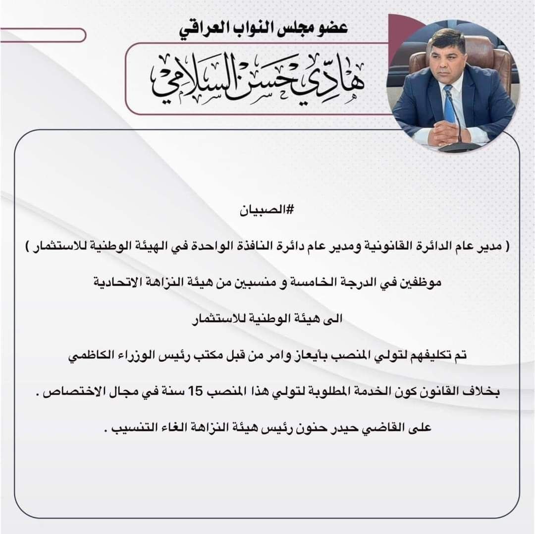 السلامي يكشف عن مخالفة قانونية للكاظمي في تنسيب مدراء في هيئة الاستثمار