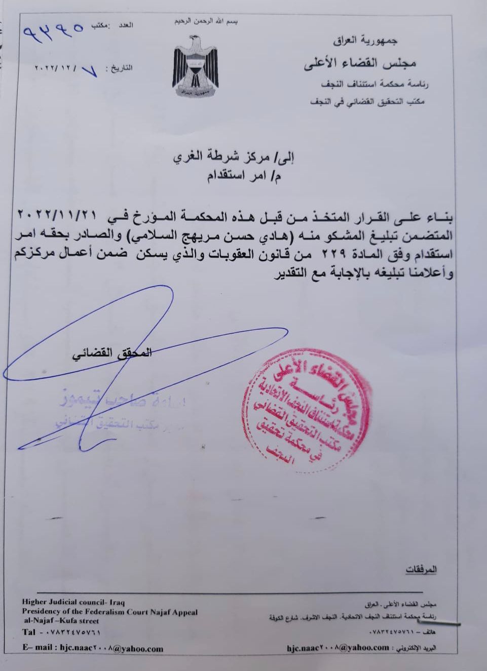 وجاء في وثيقة صادرة عن المحكمة وموجهة إلى مركز شرطة الغزي، ، أنه "بناء على القرار المتخذ من قبل هذه المحكمة المؤرخ في 21 / 11 / 2022 والمتضمن تبليغ المشكو منه هادي حسين مرهيج السلامي، والصادر بحقه أمر استقدام وفق المادة 229 من قانون العقوبات العراقي، والذي يسكن ضمن أعمال مركزكم وإعلامنا تبليغه بالإجابة مع التقدير".