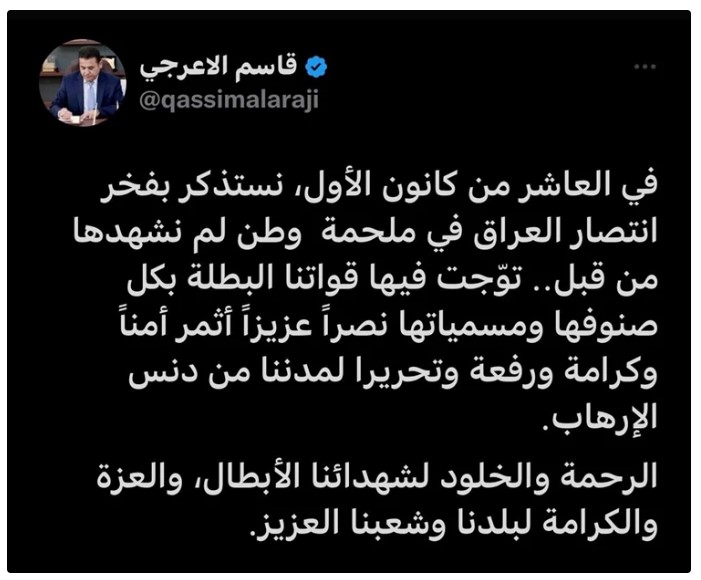 مستشار الامن القومي قاسم الاعرجي : في العاشر من كانون الأول نستذكر بفخر انتصار العراق في ملحمة وطن