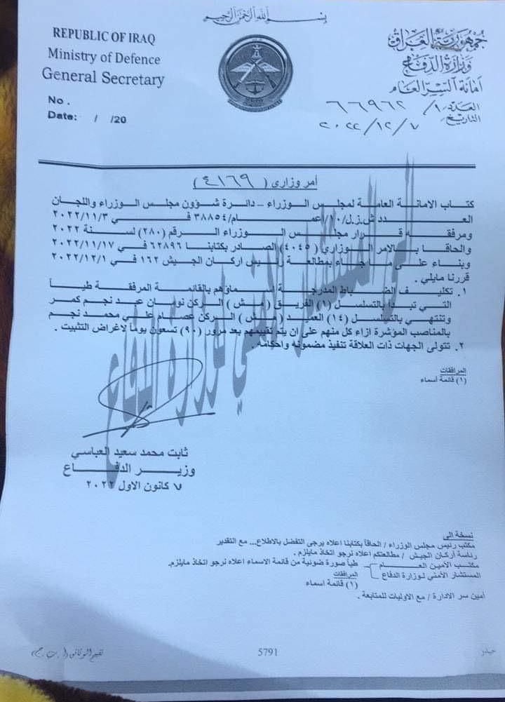 وقالت الوزارة بحسب وثيقة ، انه "تم تكليف عدد من القادة العسكرين في مناصبهم، على ان يتم تقيمهم بعد مرور ٩٠ يوم لأغراض التثبيت".