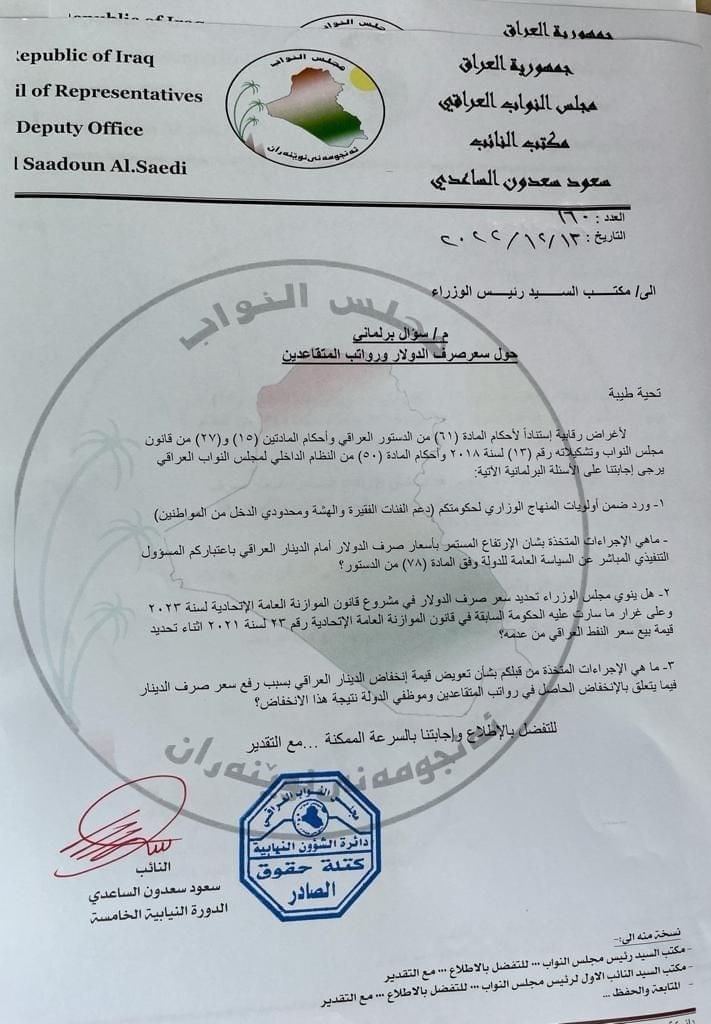 نائب عن حقوق يطالب السوداني ببيان الاجراءات المتخذة بشأن ارتفاع الدولار