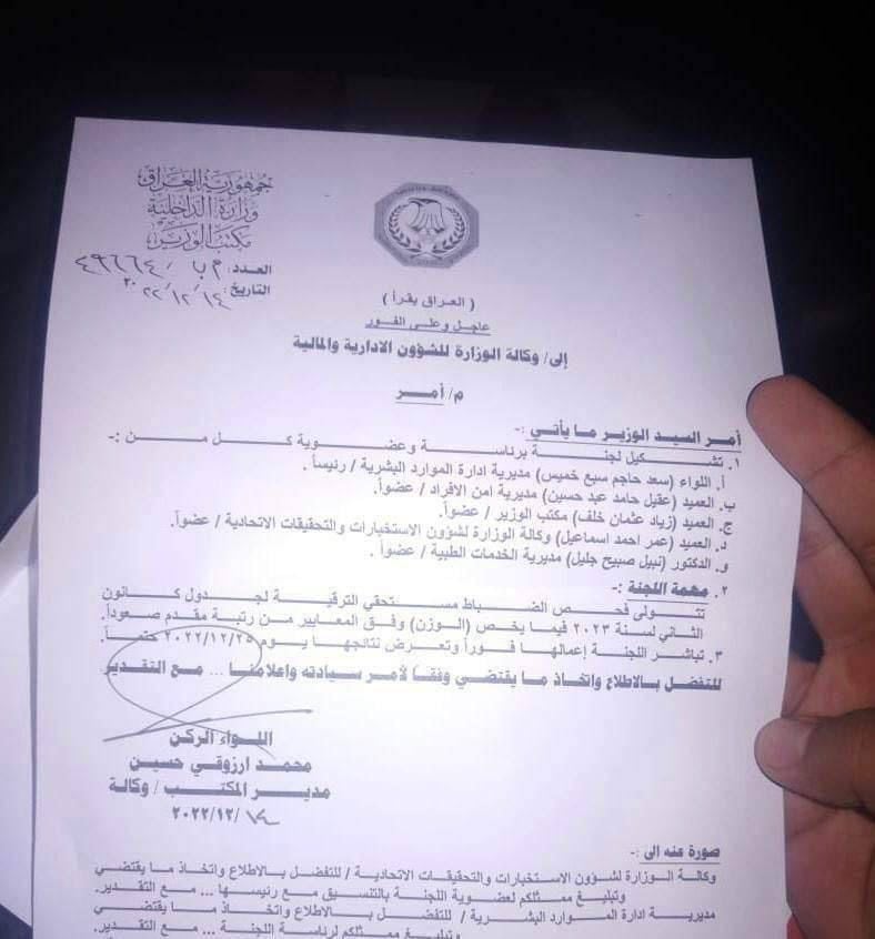 ووفقا للوثيقة، فان "مهمة اللجنة تتولى فحص الضباط مستحقي الترقية لجدول كانون الثاني 2023 فيما يخص (الوزن) وفق المعايير من رتبة مقدم صعودا".