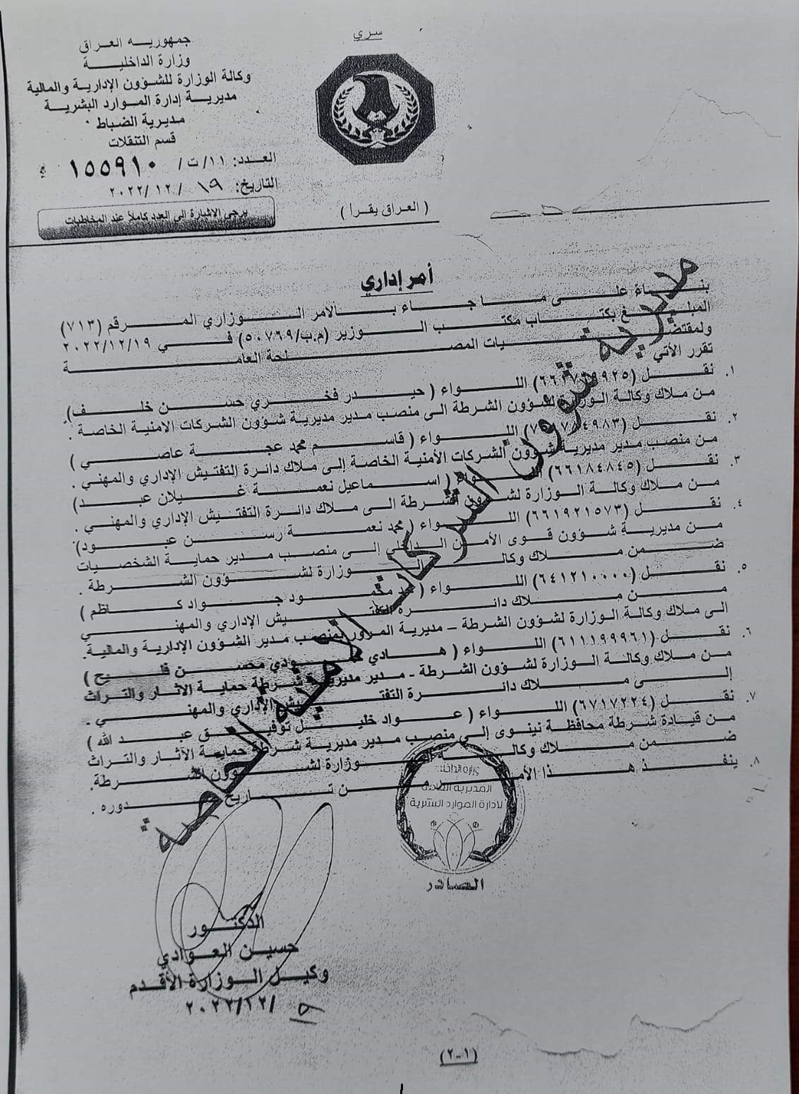 وشملت الوثيقة الموقعة باسم حسين العوادي الوكيل الاقدم للوزارة، عدة مفاصل منها مديرية شوؤن الشركات الامنية الخاصة ومديرية شوؤن قوى الأمن الداخلي.