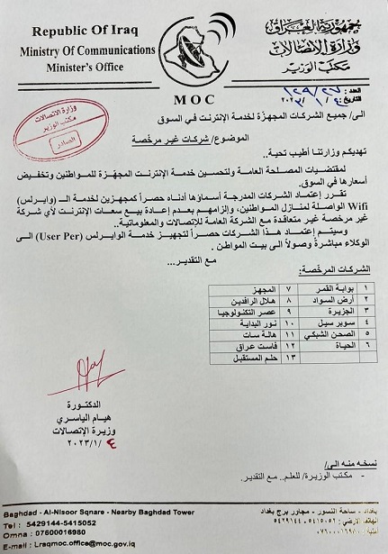 جاء ذلك في كتاب وجهته الوزارة، إلى الشركات المجهزة لخدمة الانترنت في السوق، يقضي باعتماد عدد الشركات البالغة 13 شركة حصراً كمجهزين لخدمة (الوايرلس) الواصلة إلى منازل المواطنين.