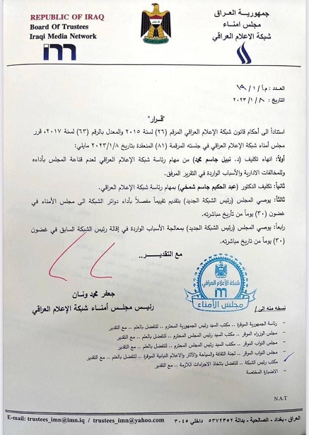 كما قرر تكليف عبد الحكيم جاسم شمخي بمهام رئاسة شبكة الاعلام العراقي".