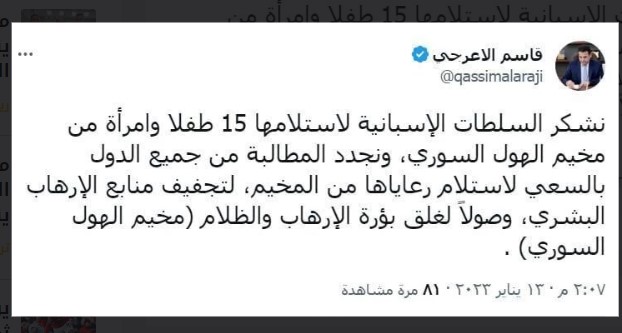 بتغريدة.. الأعرجي يعلن تسلم أسبانيا 15 طفلاً وامرأة من مخيم الهول السوري