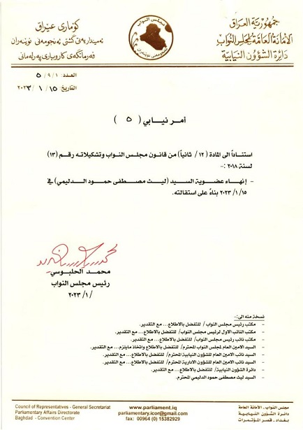 انهاء عضوية (ليث مصطفى الدليمي) في 15/1/2023 بناءً على طلبه".