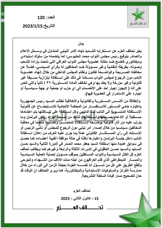 وذكر بيان للتحالف إنه "يطالب رئيس الجمهورية بالاستفسار من المحكمة الاتحادية العليا للاستيضاح حول مدى قانونية الاستقالة المنسوبة إلى الدليمي وكل استقالة على شاكلتها يتم اعتمادها مستقبلاً؛ للتأكد من صحة إجراء رئيس البرلمان وما يترتب عليه من آثار قانونية".