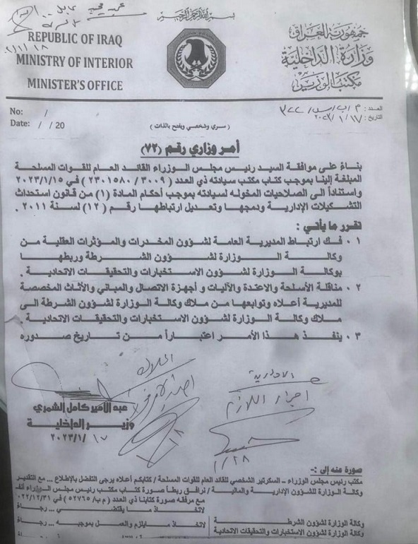 وبحسب وثيقة صادرة عن الشمري، فإنه "بناء على موافقة رئيس مجلس الوزراء، القائد العام للقوات المسلحة واستنادا الى الصلاحيات المخولة من قانون استحداث التشكيلات الإدارية ودمجها تقرر مايلي: