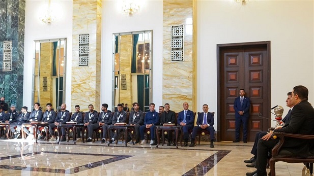 وذكر بيان لمكتب السوداني أن الأخير "استقبل وفد منتخبنا الوطني المتوج بكأس بطولة خليجي البصرة 25، وأقام مأدبة غداء على شرفهم، وذلك بحضور رئيس إقليم كردستان العراق نيجرفان بارزاني، وأعضاء مجلس الوزراء والمستشارين".