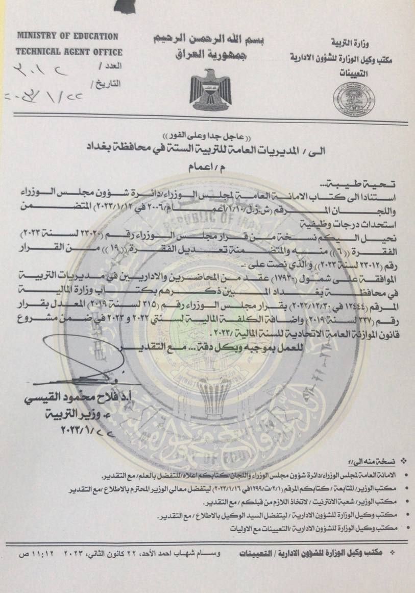 أصدرت وزارة التربية، اليوم الاحد، كتاباً عاجلاً بشأن الموافقة على شمول 17930 محاضراً وادارياً بقرار 315.