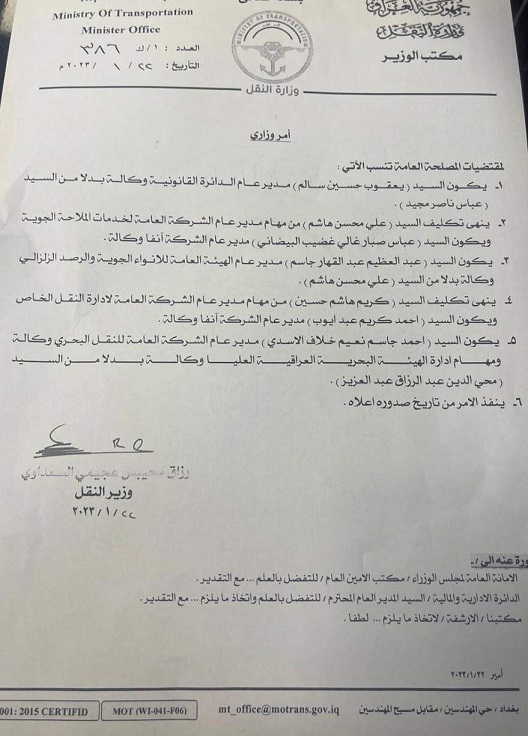وبحسب الوثيقة شملت التغييرات مدراء (الدوائر القانونية، الشركة العامة لخدمات الملاحة الجوية، إدارة النقل، والنقل البحري).
