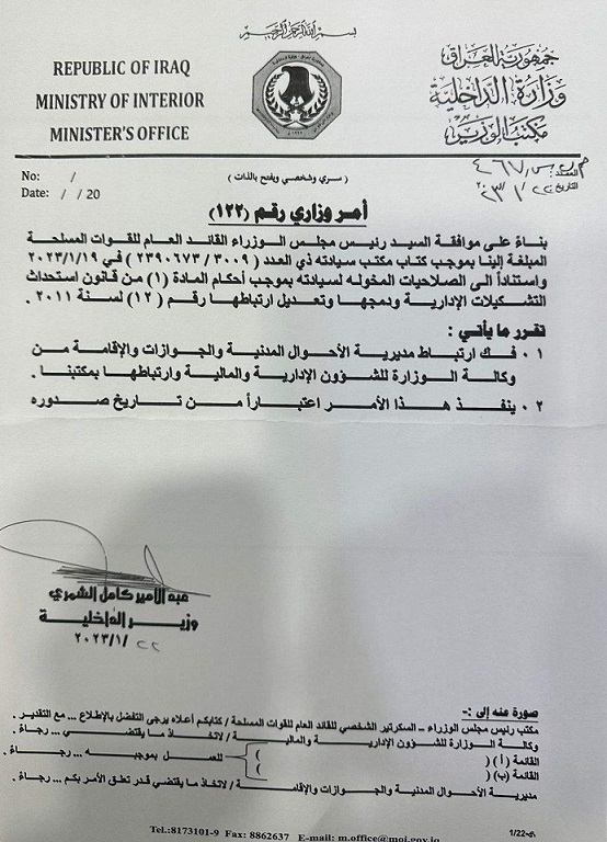 وجه وزير الداخلية، عبد الأمير الشمري، اليوم الاثنين، بفك ارتباط مديرية الأحوال المدنية والجوازات والإقامة من وكالة وزارة الداخلية وربطها بمكتبه.
