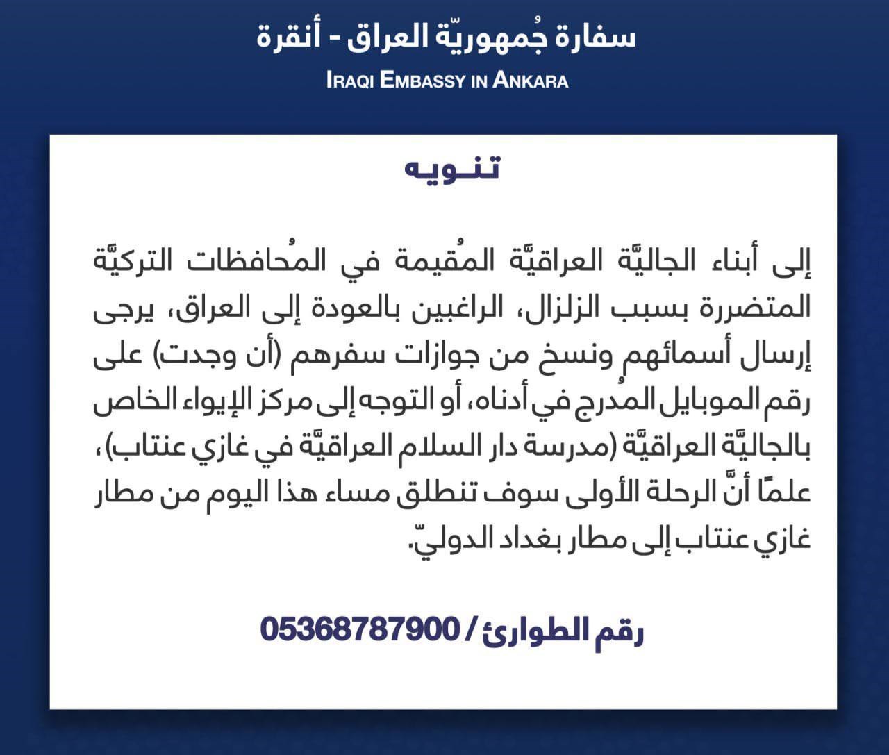 نداء من الخارجية الى العراقيين المقيمين بمناطق الزلزال في تركيا
