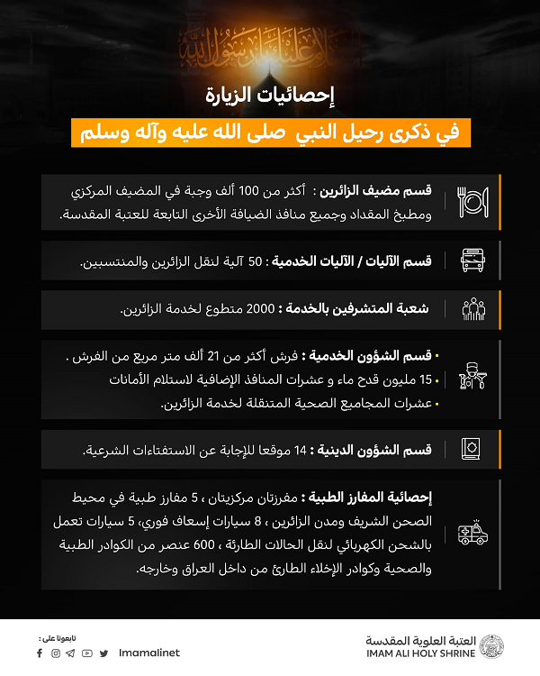 أعلنت العتبة العلوية المقدسة، اليوم الاحد، اعداد المشاركين بإحياء ذكرى المبعث النبوي الشريف.