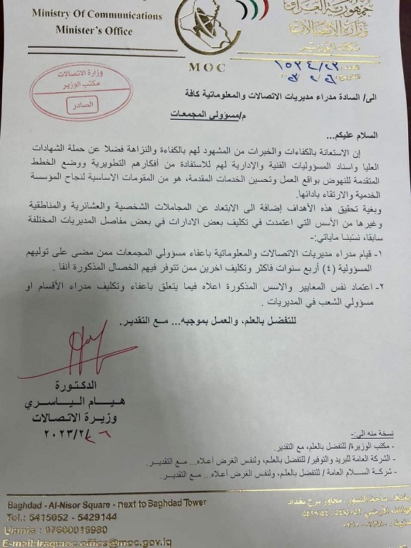 وقررت الوزارة بحسب وثيقة مذيلة بتوقيع وزيرة الاتصالات الهام الياسري"اعفاء مسؤولي المجمعات ممن مضى على توليهم المسؤولية اربع سنوات فاكثر وتكليف اخرين".