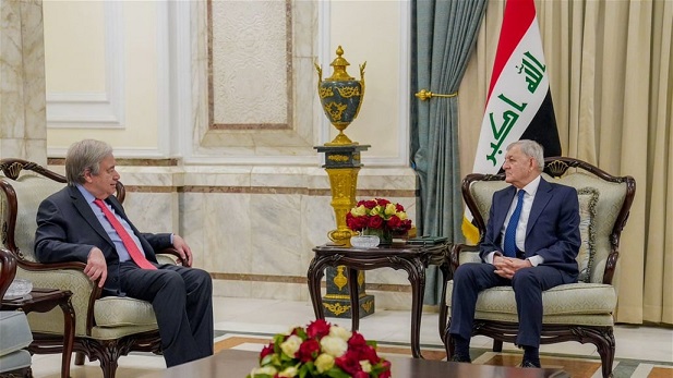 وذكر المكتب الإعلامي لرئيس الجمهورية في بيان ان "عبد اللطيف جمال رشيد استقبل الأمين العام للأمم المتحدة أنطونيو غوتيريش في قصر بغداد".