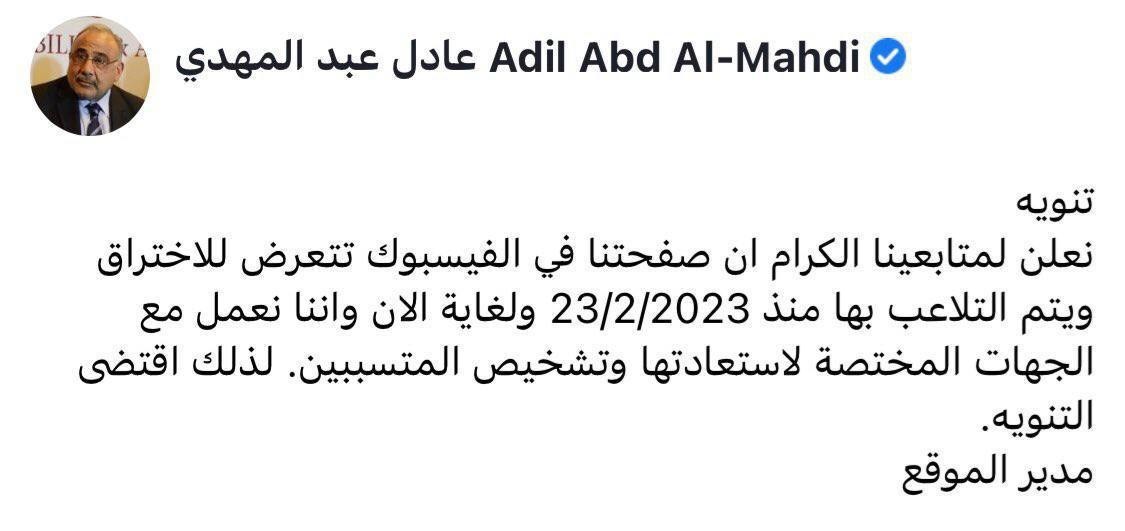 نوه رئيس الوزراء الأسبق عادب عبدالمهدي، اليوم الخميس، الى محاولات اختراق صفحته الرسمية.