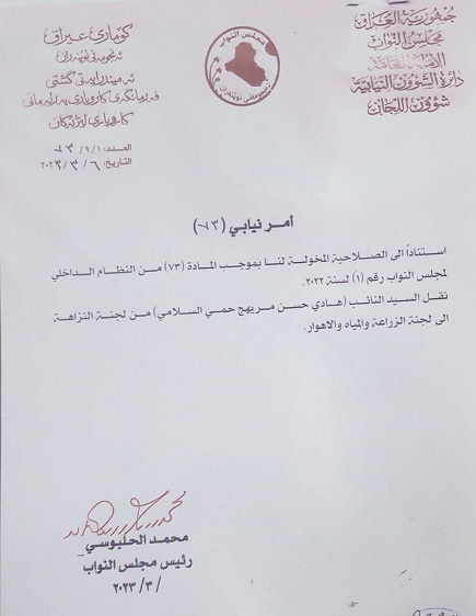 وبحسب وثيقة صادرة عن الحلبوسي  فإنه تقرر نقل النائب هادي حسن مريهج حمي السلامي من لجنة النزاهة الى لجنة الزراعة والمياه والاهوار النيابية.