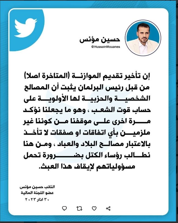 النائب حسين مؤنس: الحلبوسي يؤخر مشروع الموازنة