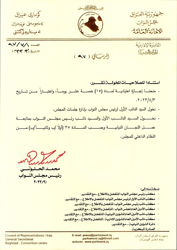 نشرت وثيقة موقعة باسم رئيس مجلس النواب محمد الحلبوسي تتضمن منح نفسه إجازة اعتيادية لمدة 15 يوما اعتباراً من 3 نيسان.