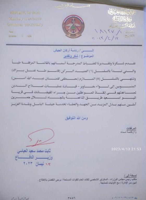 اصدر وزير الدفاع ثابت محمد العباسي امرا بتكريم الضباط والمنتسبين الذين قاموا بانقاذ العوائل جراء الفيضانات في قرية البو سعيد قرب تلال حمرين