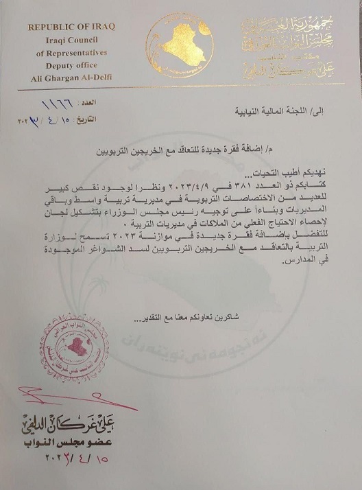 اقترح النائب علي غركان الدلفي على اللجنة المالية النيابية إضافة مادة جديدة في قانون موازنة ٢٠٢٣ تتيح لوزارة التربية بالتعاقد مع الخريجين وجاء في وثقية للدلفي انه بعد استحصاله موافقة رئيس مجلس الوزراء ووزير التربية بتشكيل لجنة لجرد احتياجات مديريات التربية من الملاكات نقترح إضافة مادة جديدة في قانون موازنة ٢٠٢٣ تتيح لوزارة التربية بالتعاقد مع الخريجين