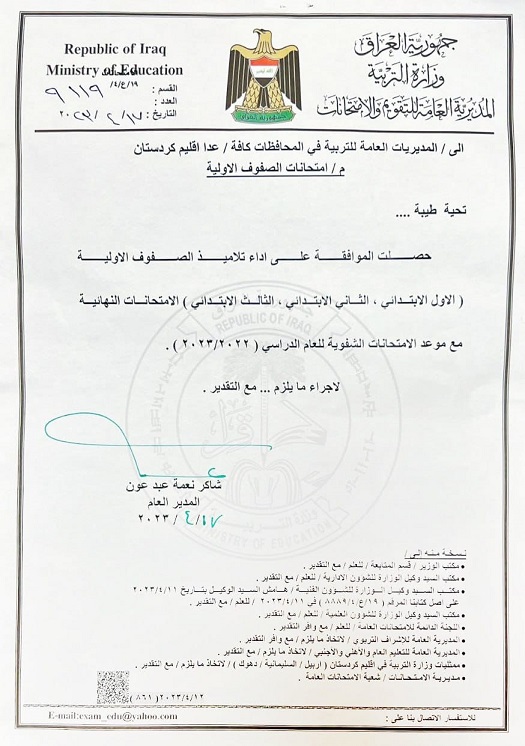 وذكرت الوزارة في بيان أن "المديرية العامة للتقويم والامتحانات أصدرت قراراً بالسماح إلى تلاميذ الصفوف الدراسية الأولية ( الأول _ الثاني والثالث الابتدائي) من أداء الامتحانات النهائية بالتزامن مع موعد الإمتحانات الشفوية للعام الدراسي الحالي ( ٢٠٢٣-٢٠٢٤ )".