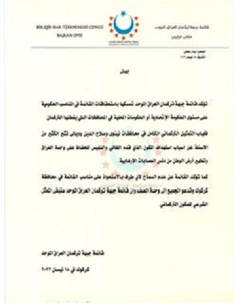 اكدت قائمة جبهة تركمان العراق الموحد تمسكها باستحقاقات القائمة في المناصب الحكومية على مستوى الحكومة الإتحادية أو الحكومات المحلية في المحافظات التي يقطنها التركمان.