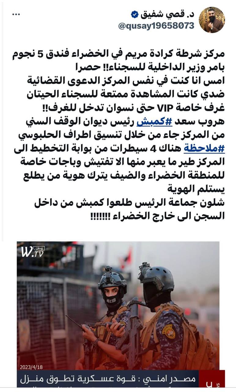 قصي شفيق مغرداً حول حادثة هروب سعدكمبش رئيس ديوان الوقف السني السابق