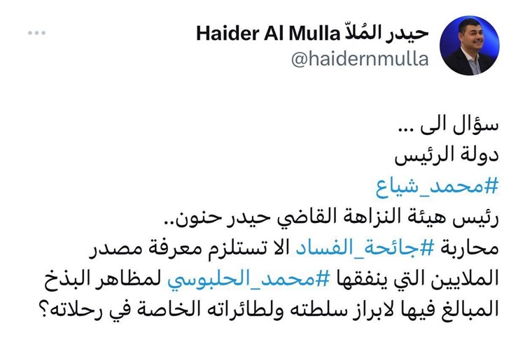 وكتب الملا، تغريدة على حسابه في تويتر،، “سؤال الى دولة الرئيس محمد شياع، رئيس هيئة النزاهة القاضي حيدر حنون، محاربة جائحة الفساد الا تستلزم معرفة مصدر الملايين التي ينفقها محمد الحلبوسي لمظاهر البذخ المبالغ فيها لابراز سلطته ولطائراته الخاصة في رحلاته؟".