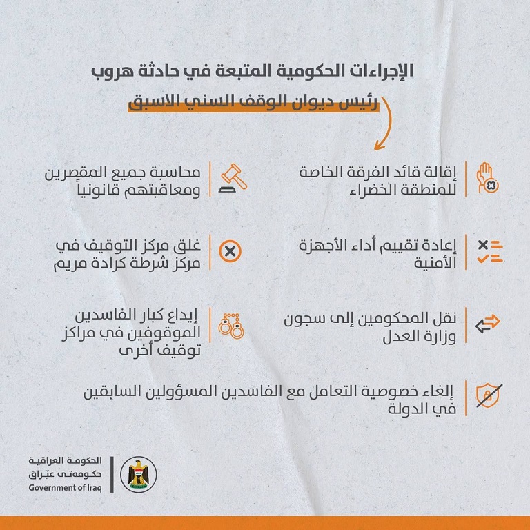 اعلن الناطق باسم القائد العام للقوات المسلحة اللواء يحيى رسول عن الإجراءات الحكومية المتبعة في حادثة هروب رئيس ديوان الوقف السني الأسبق سعد كمبش.
