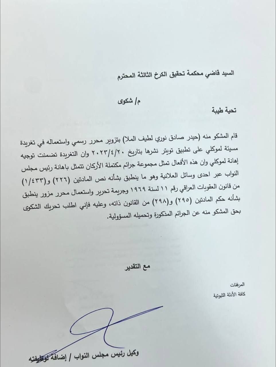 اقام ممثل رئيس مجلس النواب محمد الحلبوسي دعوى قضائية بحق حيدر الملا يتهمة تزوير محرر رسمي واهانة رئيس البرلمان.